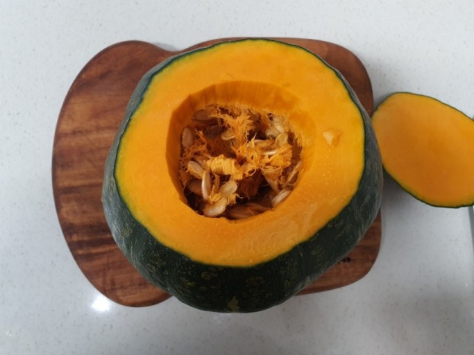 단호박은 단단하여 칼질이 쉽지 않고 살짝 지거나 전자레인지에 단호박 줄기의 꼭지를 아래로 해서 약 5~7분 정도 돌려주면 칼질이 엄청 쉬워집니다. 전체를 반으로 잘라 씨를 숟가락으로 긁어 제거하시면 돼요.